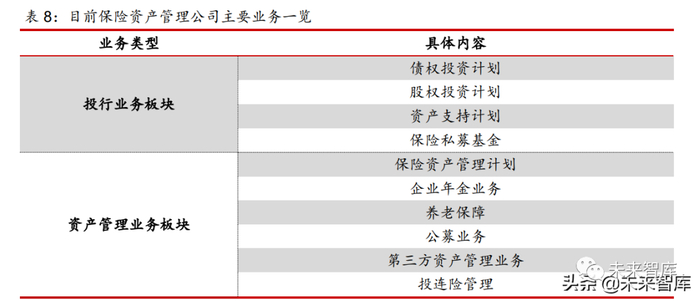 目前,保险资产管理公司主要从事的两大业务板块:投行业务板块和资产管理业务板块。