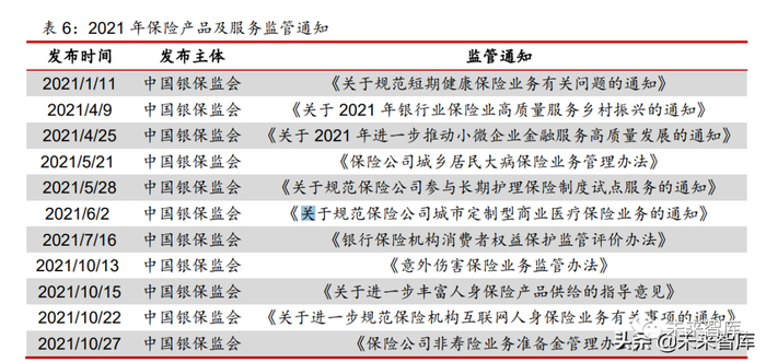 2021 年,以中国银保监会为主的监管机构发布了多项保险险种和服务的改革和监管通知, 来规范保险公司的行为,深化保险产品的供给侧改革,丰富保险产品供给、发展普惠保险产 品,切实保障消费者权益,来推动保险市场高质量发展。