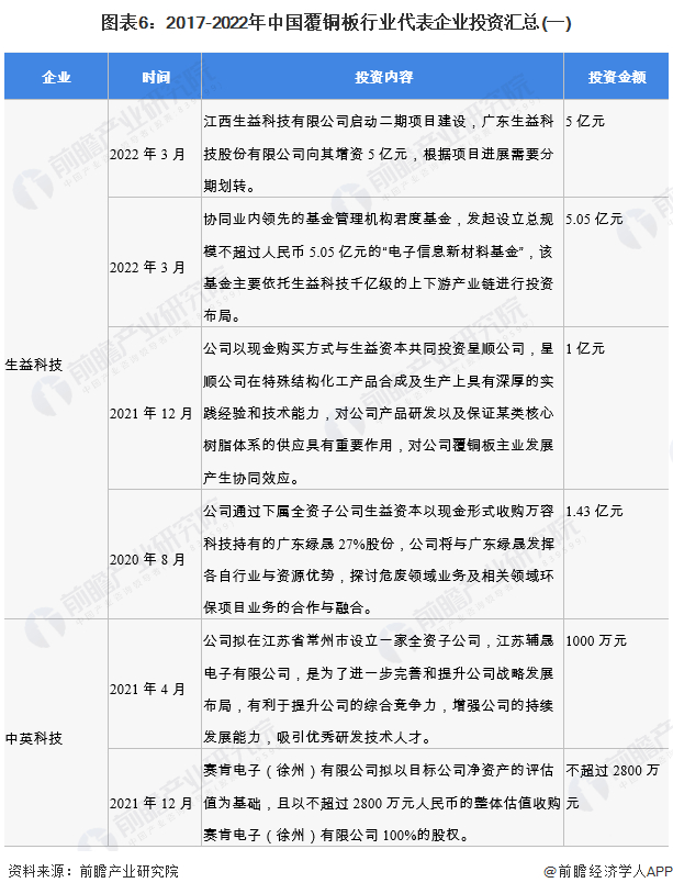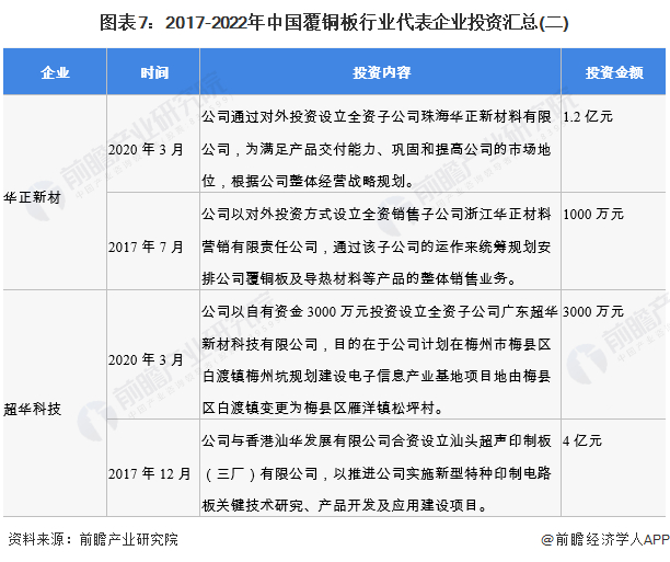 覆铜板行业代表性集团对覆铜板制造的投资动向主要体现在设立新的全资子公司或收购外部公司,扩展覆铜板业务,例如通过设立全资子公司新建厂房、研究高技术覆铜板产品等。