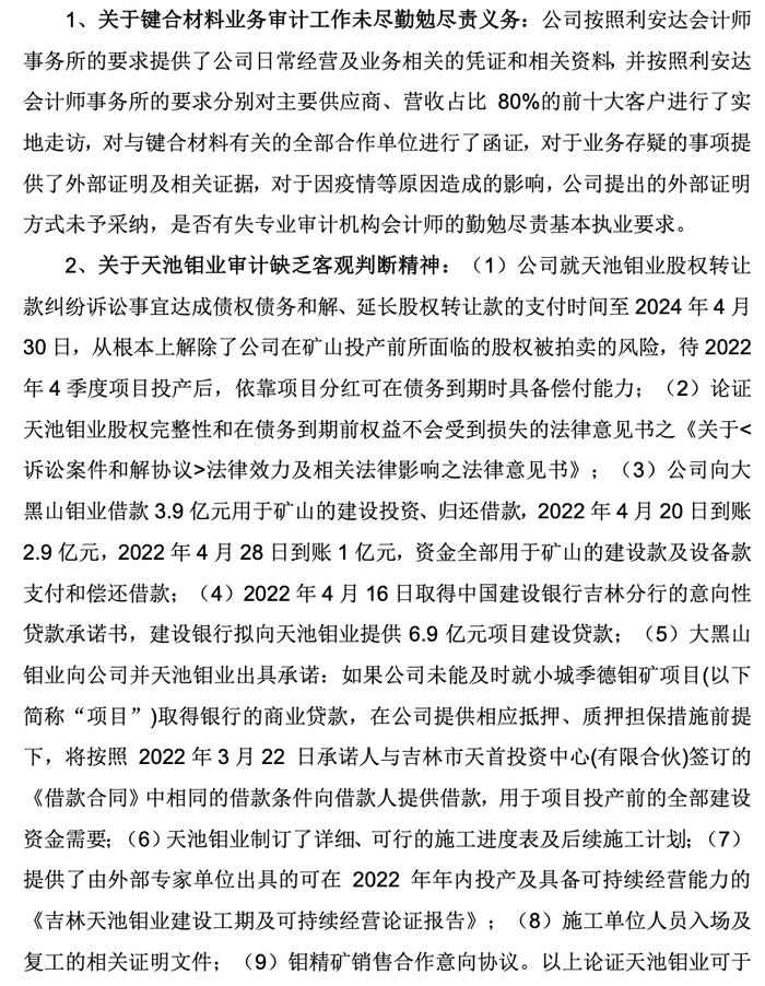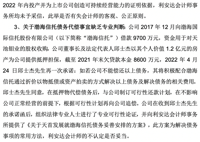 利安达也在回函中提到,鉴于事务所对公司2021年度财务报告审计工作尚在现场审计阶段,就目前已取得的证据资料和执行的审计程序,未见异常或不合规事项。