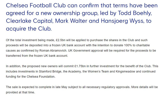 切尔西表示,这笔交易预计将于5月底完成,前提是获得所有必要的监管部门批准。届时将会提供更多细节。