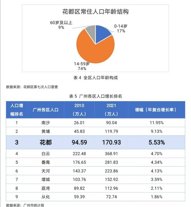 在年龄结构上,花都的少儿人口比重不降反增,提高了4.52%,劳动适龄人口(15-59岁)占比73.87%,保持较高水平。