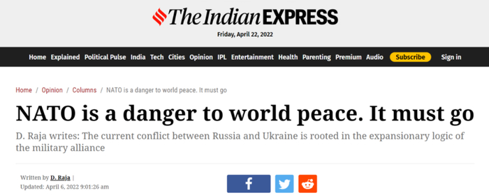 北约种种操作,说到底都是为了维护美国的全球霸权,充当着美国威胁世界和平的帮凶。 也难怪印度共产党总书记多赖萨米·拉贾在《印度快报》发表文章:《北约对世界和平构成威胁,必须解散》。