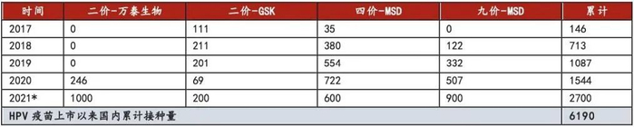 ▲国内HPV疫苗上市以来批签发量统计,单位:万支。(来自华西证券研报。由于2021年4月后中检院不再更新疫苗批签发具体数据,因此2021年批签发量为测算数据。)