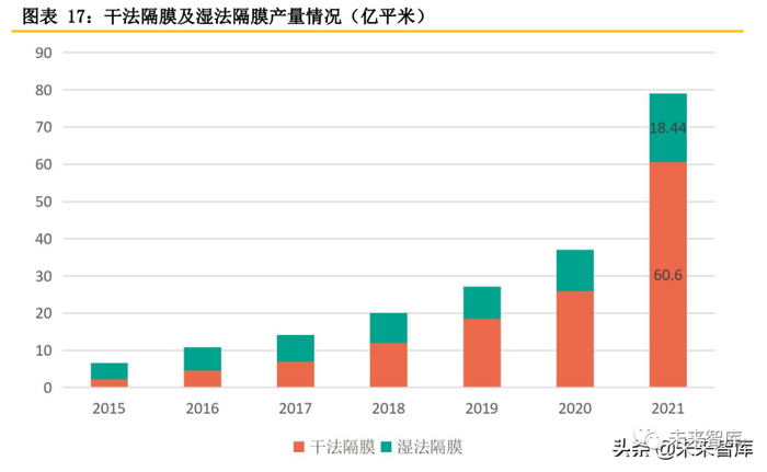 湿法隔膜市场占比持续提升,2021年动力市场持续超预期的表现叠加湿法隔膜新增产能持续释 放,湿法隔膜牢牢占据市场主导地位,市场占比达74%。下游对隔膜性能要求逐步提升,湿法隔膜 厚度更薄,可提高锂电池能量密度;同时下游需求旺盛,行业供求偏紧,湿法隔膜产能投放大于干 法隔膜,推动湿法隔膜出货量。2021年干法占比虽有所减少,但其出货量保持快速增长,主要受储 能、小动力电池增长带动。(报告来源:未来智库)