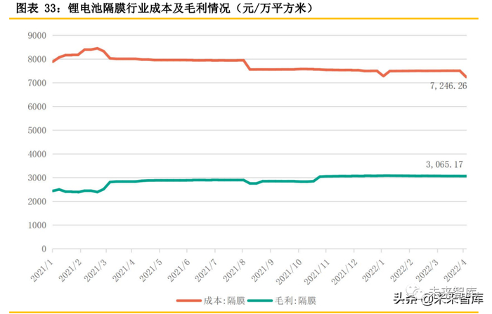 各大隔膜厂商受益于行业需求旺盛,产能加速释放,随着隔膜出货规模的扩大,隔膜企业单位 成本下降明显,叠加客户结构优化,盈利能力提升趋势明显。根据百川盈孚数据,目前锂电池湿法 隔膜厂家的综合成本约7246.26元/万平方米,短期内锂电池隔膜成本压力变动不大。近5年内,拥 有产能优势的头部厂商,已经将折旧成本、总成本降低了一半。而成本的下降,可以让头部厂商在 利用价格优势扩大市场份额的同时,还不必担心利润空间的下降,目前隔膜行业平均毛利维持在 3068.17元/万平方米左右。(报告来源:未来智库)
