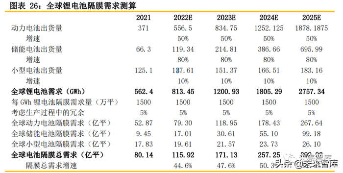 假设全球汽车动力电池出货量保持50%的增速;小型电池(包含消费类电池、小动力类电池等) 稳定发展,叠加5G带来新应用,每年增速10%;储能领域随着商业模式成熟及成本下降而显著发展, 每年增速80%。按照1GWh锂电池对应隔膜需求1500万平方米估算,考虑生产过程中的5%冗余, 我们测算2022-2025年全球锂电池需求预计分别为813.45、1200.93、1805.29、2757.34GWh,对 应隔膜需求分别为115.92亿平米、171.13亿平米、257.25亿平米、392.92亿平米,隔膜需求增速分 别为44.6%、47.6%、50.3%、52.7%;其中全球动力电池隔膜需求预计267.64亿平米,储能电池隔 膜需求99.18亿平米,小型电池隔膜需求26.10亿平米。