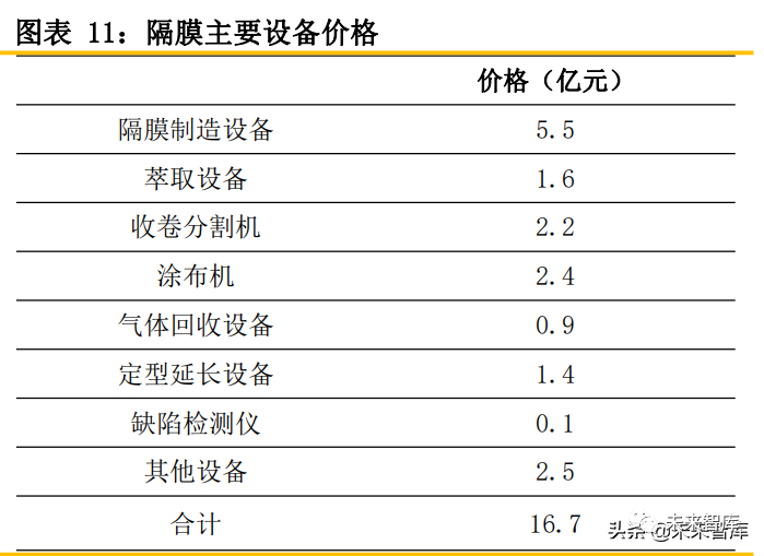 隔膜项目需投入大量资金,设备投资占比在50%以上。隔膜企业新建或更新产线时,需要投入 大量资金,单平隔膜产能投资在3.6元左右,即一亿平隔膜项目投资在3.6亿元左右,其中设备投资 占比较大,一般高于50%。