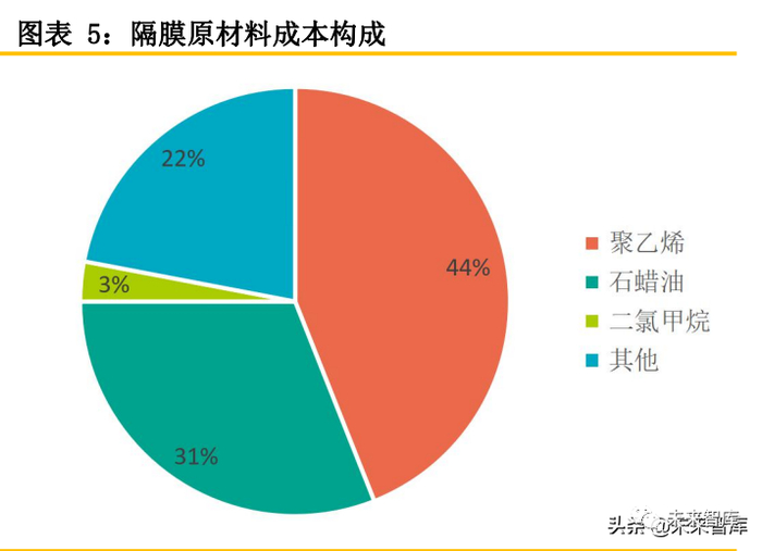 隔膜的成本包括了原料成本、能源成本、人工成本及折旧摊销等。其中原料成本占比最大,约 为41%,主要为制作隔膜所需的主材和辅助材料,其中包括主材PE、PP和辅材石蜡油(白油)、 二氯甲烷等等,合计占比近80%。能源成本主要包括水电费用,占比18%。隔膜设备成本高,导致 折旧摊销占比高,达到23%。隔膜厂需持续降本以保持竞争优势,龙头企业通过资本壁垒,可以积 累起先发规模和成本优势。