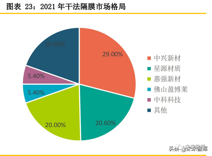 在干法隔膜方面,整体呈现出‘三足鼎立’的市场格局。中兴新材在产能释放以及下游大客户 需求放量的情况下,一举成为干法隔膜龙头企业。第一梯队中兴新材、星源材质、惠强新材市场占 有率稳步提升,2021年干法隔膜市场CR3接近70%。2021年隔膜龙头恩捷股份与Celgard成立合资 公司布局干法隔膜,干法隔膜产品预计2022年将量产销售,结合恩捷股份携手宁德时代布局的20 亿平米干法隔膜产能,预计未来干法隔膜的市场格局将会变动。