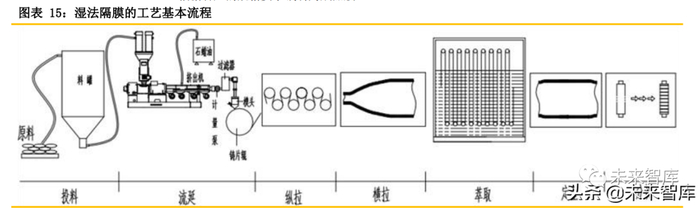 隔膜生产工艺包括原材料配方和快速配方调整、微孔制备技术、成套设备自主设计等诸多工艺。其中,微孔制备技术是锂电池隔膜制备工艺的核心,隔膜基膜制造根据微孔成孔机理主要分干法和 湿法两种。目前,三元材料动力锂电池基本采用湿法隔膜,而同样需要不断提高能量密度的磷酸铁 锂电池亦有宁德、国轩等主流厂家选用湿法隔膜。