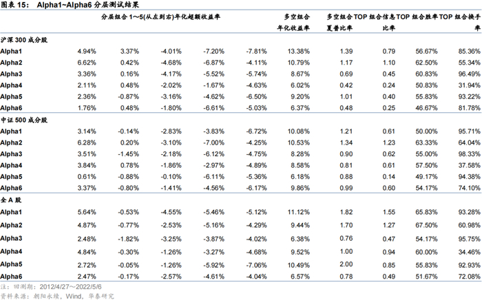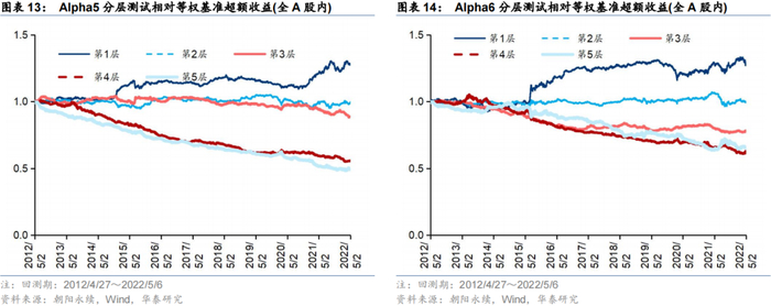 华泰金工在2022年4月7日发布了报告《基于遗传规划的一致预期因子挖掘》,使用遗传规划算法挖掘一致预期因子,本文对其中的6个因子进行跟踪。今年以来多数因子多头组合跑赢基准,其中Alpha5(Alpha5= ts_return(mul(CON_GPE, CON_CAGR), 60))多头组合在沪深300成分股超额收益为8.29%,中证500成分股超额收益为4.20%,全A股超额收益为3.55%。