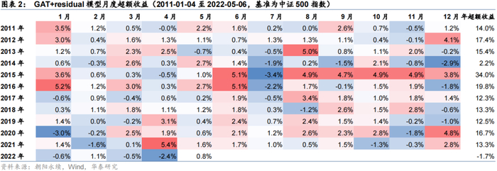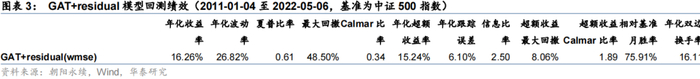 截至2022年5月6日,GAT+residual模型近两周超额收益为1.22%,今年以来超额收益为-1.67%。模型2011年初回测以来年化超额收益率为15.24%,年化跟踪误差为6.10%,信息比率为2.50,超额收益最大回撤为8.06%,超额收益Calmar比率为1.89。