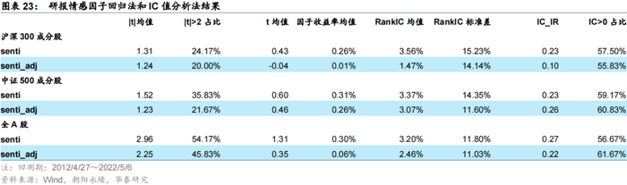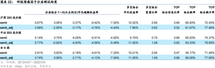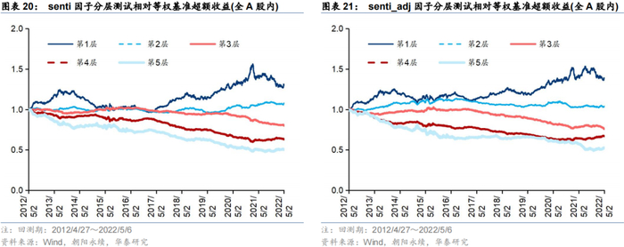 4.使用传统的因子构建方法,通过分析师研报的情感分析结果构建选股因子。我们构建了两个因子senti和senti_adj,其中senti_adj对负面情感样本增大权重,更能体现研报情感因子的增量信息。
