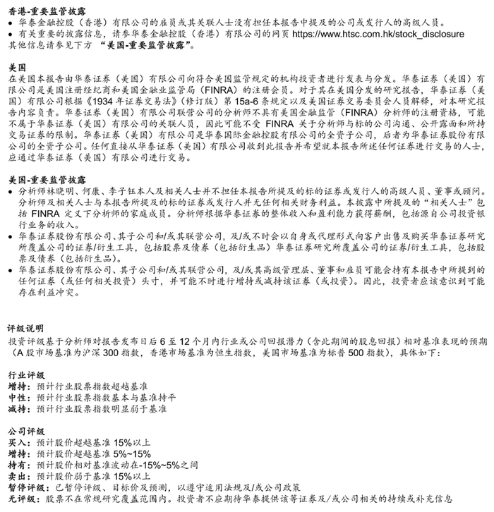 在任何情况下,本公众号中的信息或所表述的意见均不构成对客户私人投资建议。订阅人不应单独依靠本订阅号中的信息而取代自身独立的判断,应自主做出投资决策并自行承担投资风险。普通投资者若使用本资料,有可能会因缺乏解读服务而对内容产生理解上的歧义,进而造成投资损失。对依据或者使用本公众号内容所造成的一切后果,华泰证券及作者均不承担任何法律责任。