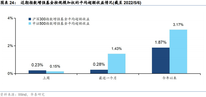 截至2022年5月6日,公募沪深300指数增强基金上周平均超额收益为0.23%,最近一个月平均超额收益为0.28%,今年以来平均超额收益为1.87%。公募中证500指数增强基金上周平均超额收益为0.15%,最近一个月平均超额收益为1.43%,今年以来平均超额收益为3.17%。