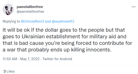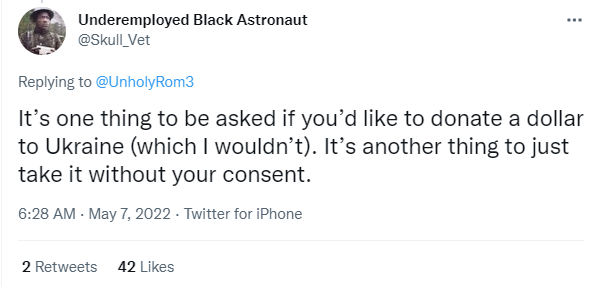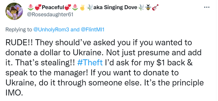 “太粗鲁了!他们应该问你是否愿意向乌克兰捐赠一美元,而不是假设(你愿意),然后加上这笔钱。那是偷东西!!是盗窃!我会要求退还我的1美元并与经理交涉!如果你想向乌克兰捐款,请找其他人。在我看来,这是原则问题。”