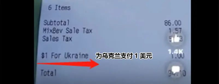 近日,一位美国网友晒出了一张消费账单,账单上要求“为乌克兰支付1美元”($1 for Ukraine),很多人看到后坐不住了。