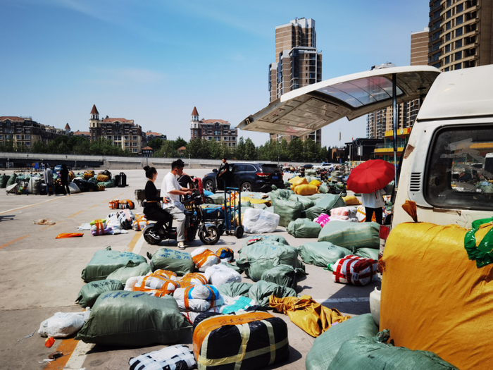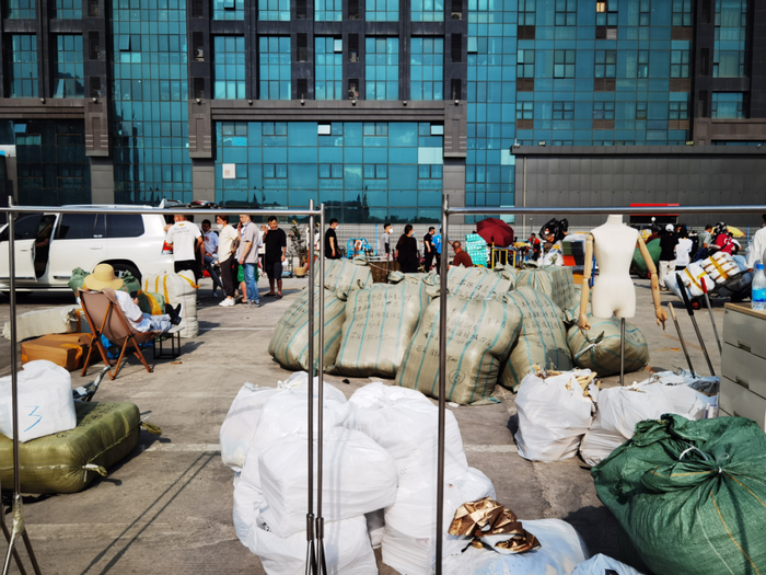 5月6日一早,燕郊淅淅沥沥下起了雨,在东贸服装城西侧停车场中,随处可见成堆打包好的服装,有的用塑料布盖着,有的就裸露在雨中。商户们还在陆续从西门冒着雨推出一车车服装。