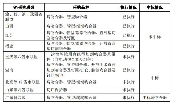 截至2021年12月31日,渝、黔、滇、豫四省联盟、江苏、山西、福建、湖南、重庆等八省市联盟、北京等18省市联盟、广东省联盟、山东等四省联盟等省份/采购联盟陆续开展涉及吻合器等医用耗材的带量采购。在已执行带量采购的省/采购联盟中,公司未中标省份仅对部分开放式吻合器实施带量采购且数量较少,公司在上述省份执行带量采购的吻合器销量亦较少,因此,未中标地区目前对公司吻合器销售收入的影响较小。
