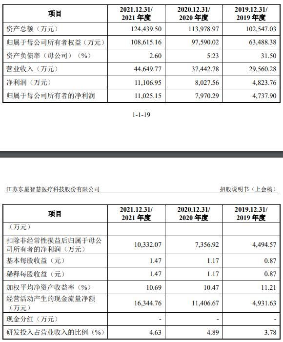 2019年、2020年、2021年,东星医疗的净利润分别为4823.76万元、8027.56万元、11,106.95万元;归属于母公司所有者的净利润4737.90万元、7970.29万元、11,025.15万元;扣除非经常性损益后归属于母公司所有者的净利润4494.57万元、7356.92万元、10,332.07万元;经营活动产生的现金流量净额分别为4931.63万元、11,406.67万元、16,344.76万元。