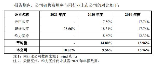 2019年、2020年、2021年,东星医疗研发费用分别为1118.06万元、1832.42万元、2067.41万元,占同期营业收入的比重分别为3.78%、4.89%、4.63%。报告期内,公司销售费用分别为4657.70万元、3579.29万元和4487.01万元,分别占当期营业收入的15.76%、9.56%和10.05%,主要由职工薪酬、会务费、差旅费、咨询服务费等组成。报告期内,公司研发费用率低于同行业上市公司平均值,销售费用率低于同行业上市公司的平均值。
