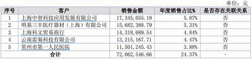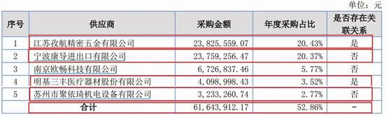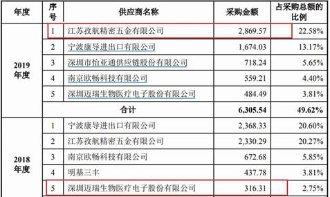供应商方面,公司2018年年报显示,苏州市聚依琦机电设备有限公司以323.33万元的采购金额位列东星医疗第五大供应商,而招股书披露的2018年第五大供应商为深圳迈瑞生物医疗电子股份有限公司,采购金额为316.31万元。可见,东星医疗对深圳迈瑞生物医疗电子股份有限公司的采购金额低于对苏州市聚依琦机电设备有限公司的采购金额,而招股书披露的2018年度第五大供应商却是深圳迈瑞生物医疗电子股份有限公司。