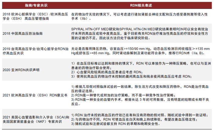 资料来源:《2018 ESC/ESH Guidelines for the management of arterial hypertension》,《2018 年中国高血压防治指南修订版(征求意见稿)》,《2019 台湾高血压协会/台湾心脏学会肾脏去神经术治疗高血压共识声明》,《Renal Denervation in Asia: Consensus Statement of the Asia Renal Denervation Consortium》,《European Society of Hypertension position paper on renal denervation 2021》,《Renal denervation in hypertension patients: Proceedings from an expert consensus roundtable cosponsored by SCAI and NKF》,中金公司研究部