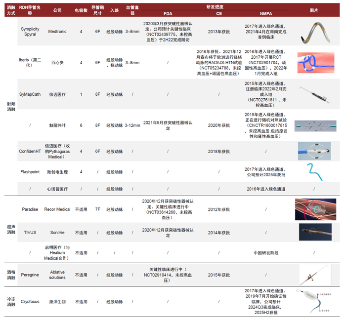 RDN在探索多种消融方式,射频及超声消融占据主导地位。截至2022年3月,FDA认定的RDN突破性器械均为射频或超声消融;部分厂家亦在尝试冷冻消融及酒精消融。从入路看,根据弗若斯特沙利文,百心安Iberis是全球唯一允许经股动脉和经桡动脉入路的RDN产品。