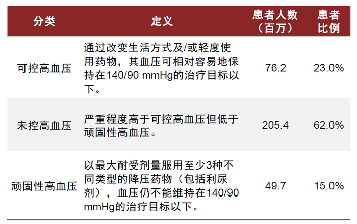 注:当前对顽固性高血压的定义尚不一致,如《难治性和顽固性高血压定义的当代认识》(中华高血压杂志, 2018, 26(9):3)指出,对于用≥3种降压药不能达标的患者称为难治性高血压,用≥4种降压药可达标称为可控制难治性高血压,用≥5种降压药仍不能达标的高血压患者称为顽固性高血压。此处采用弗若斯特沙利文口径。