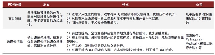 盲目消融可能为RDN有效率有限的原因之一,期待标测后选择性消融解决痛点。当前的RDN几乎均以盲目的方式对整段肾动脉进行消融,而根据2019年美国经导管心血管治疗学术会议(TCT 2019)数据,肾动脉周围神经中占比73.5%的交感神经被消融后有降低血压的效果,17.9%的副交感神经被破坏后,血压会不降反升。使用肾神经刺激进行标测后,选择性地对交感神经消融可能是有潜力的发展方向,同时肾神经刺激具有即时验证手术效果、筛选适合RDN的患者人群等优势。目前,肾神经标测技术应用于RDN仍处于临床研究阶段,尚未有临床随访数据公布,我们期待此技术解决RDN有效率的痛点。进行相关研究的公司包括信迈医疗、Pythagoras(已被信迈医疗收购)等,信迈医疗国际首创的肾神经标测/选择性消融系统已完成中国注册临床患者入组。