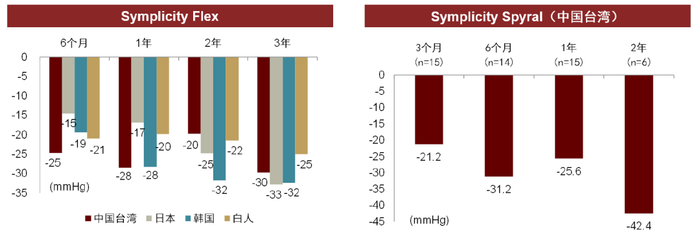 资料来源:《Device-based therapies for arterial hypertension》(Nature Reviews Cardiology 17, pages614–628 (2020)),《Long-term efficacy and safety of renal denervation in the presence of antihypertensive drugs (SPYRAL HTN-ON MED): a randomised, sham-controlled trial》(The Lancet, 2022.),中金公司研究部