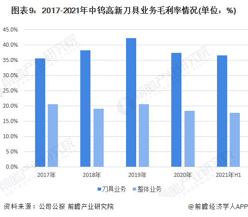 近五年来,中钨高新的刀具业务毛利率整体保持在35%以上的水平,其中在2019年高达42.2%,反映出企业的刀具业务获利水平较高;并且与企业整体经营毛利率相比,相差15个百分点以上,刀具业务已经成为支撑企业盈利的核心业务。