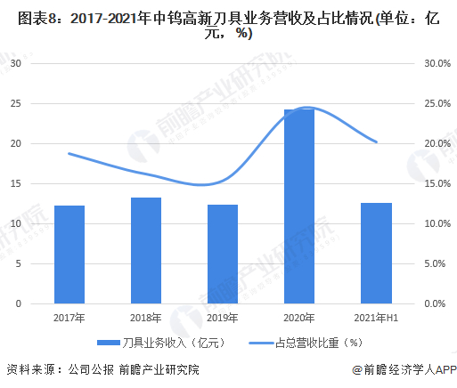 近五年来,中钨高新的刀具业务营收整体呈现增长态势,2020年全年超过24亿元,同比增长95%;2021年上半年营收超过12亿元。从刀具业务占总营收占比来看,整体保持在15%以上的水平,其中2020-2021年占比增长明显,整体保持在20%以上水平,刀具业务逐渐在中钨高新企业经营中占据着越来越重要的地位。