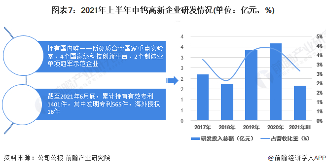 中钨高新公司拥有国内唯一一所硬质合金国家重点实验室、4个国家级科技创新平台、2个制造业单项冠军示范企业,并承担了多项国家级、省级国家重点科技专项项目。截至2021年6月底,企业累计持有有效专利1401件(其中发明专利565件,海外授权16件),专职研发人员超过1000余人,研发投入保持增长,技术创新实力雄厚。
