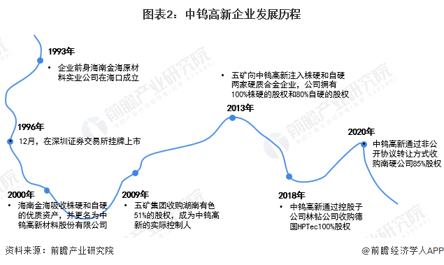 中钨高新企业前身是海南金海原材料实业公司,于1993年在海口成立,并于1996年12月在深交所上市。2000年,海南金海吸收株洲硬质合金集团有限公司(简称“株硬”)和自贡硬质合金有限责任公司(简称“自硬”)的优质资产,更名为“中钨高新材料股份有限公司”,之后经过一系列的兼并重组,成长为国内优秀的钨产业链领先企业,并以打造“具有全球竞争力的世界一流钨产业集团”为发展目标不断向前迈进。