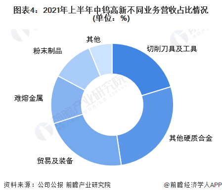 从不同业务营收占比来看,2021年上半年,公司在切削刀具及工具业务方面的营业收入超过12亿元,占总营业收入的比重约20%,其他硬质合金业务的营收占比约27%,贸易及装备业务营收占比约23%,难熔金属及粉末制品的业务营收占比均超过10%。