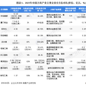 注:1)以上仅分析有相关业务数据披露的上市企业;2)上述刀具销售额市占率统计的是2020年的国内市场销售数据;3)上述企业并未单独披露刀具业务研发投入数据,在此仅能提供企业整体研发投入数据;4)企业竞争力评价最高为★★★★★。
