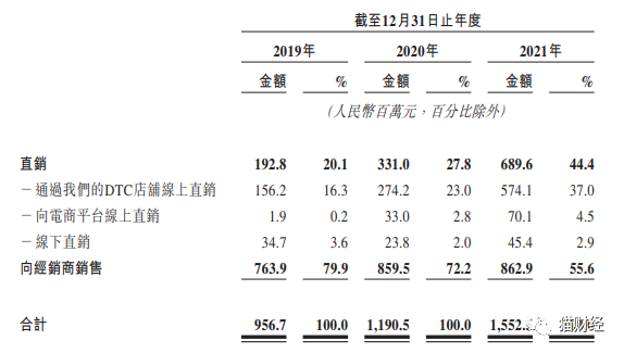 事实上,巨子生物已意识到依赖的严重性。近年来,公司加强了直销渠道的构建和投入,其直销渠道收入占比从2019年的20.1%提升至2021年的44.4%。直销方面,巨子生物主要通过电商及社交媒体平台(包括天猫、京东、抖音、小红书及拼多多)上直接面向消费者的DTC店铺进行销售,以及向京东及唯品会等电商平台的自营部门进行销售。