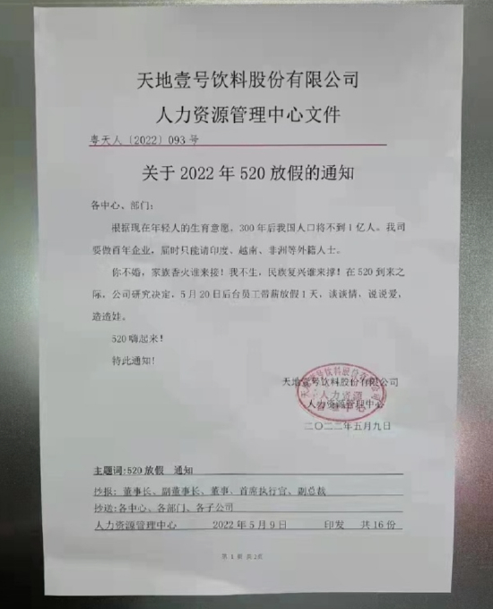 据媒体报道,今日网上流传出一份关于天地壹号5月20日的放假通知。通知称,天地壹号饮料公司决定520给员工放假一天去谈恋爱生娃。通知中提及“根据现在年轻人的生育意愿,300年后我国人口将不到一亿人”、“公司决定……放假1天,谈谈情,说说爱,造造娃”。