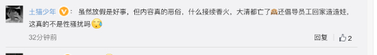 对此,有网友表示,虽然放假是好事,但内容真的恶俗,什么接续香火,大清都亡了🙉还倡导员工回家造造娃,这真的不是性骚扰吗。