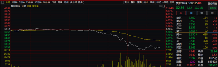 今天,市场上最意外的事无疑是爱尔眼科的杀跌。该股午后持续跳水,跌幅一度扩大至11%,总市值回到1800亿下方。随后,股价在10%上下波动。