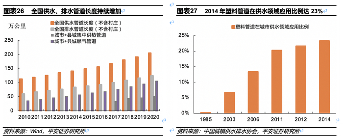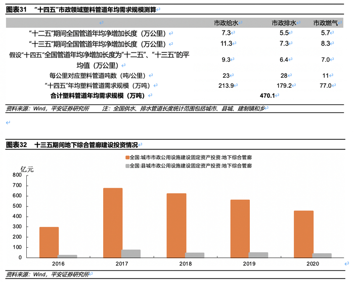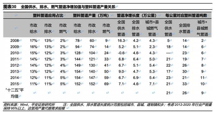 中长期看,估算“十四五”市政领域年均需求约470万吨,略低于2019年474万吨,仍为塑料管道重要应用领域。为定量测算“十四五”期间市政领域塑料管道需求,我们利用全国供排水管道等建设情况与塑料管道产量关系进行估算。