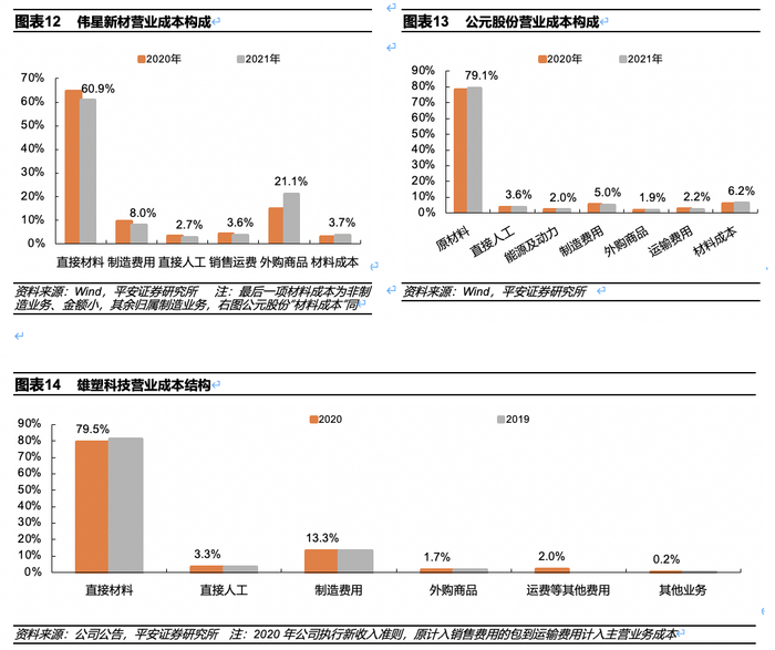 塑料管道成本中原材料占比近八成。塑料管道主要原材料PVC、PE、PP属于石化下游产品,材料成本占总成本近八成,如公元股份2021年原材料成本占营业成本79.1%、雄塑科技2020年原材料成本占比79.5%,伟星新材因外购商品比重高、直接材料占比较低,2021年仅为60.9%。