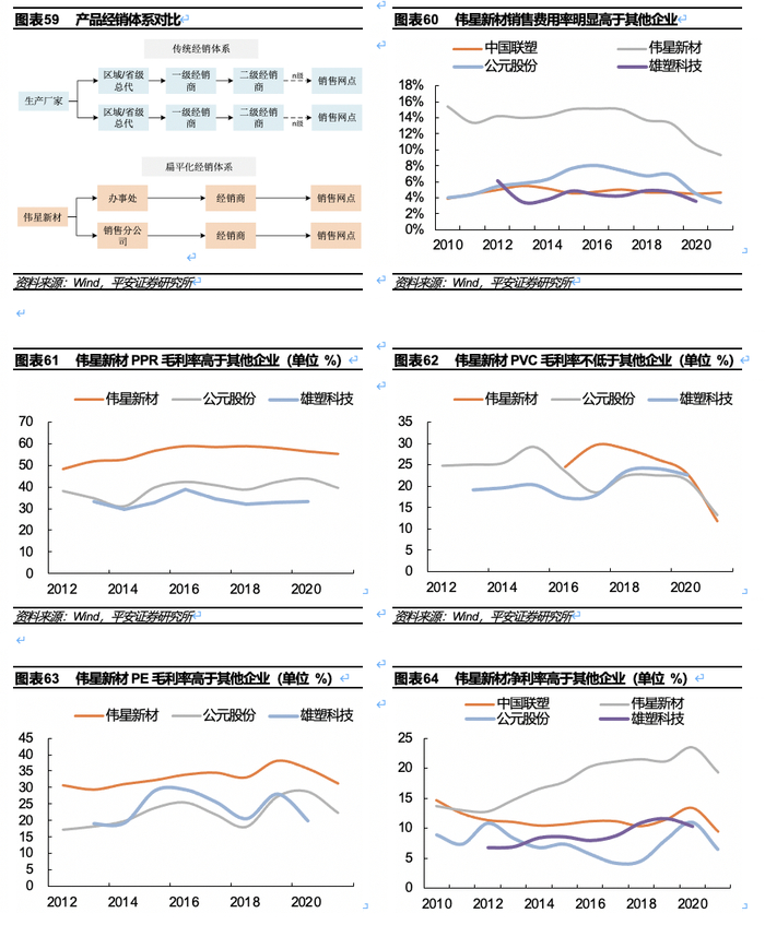 伟星新材广铺营销网点、并通过渠道扁平化策略,奠定营销优势。目前伟星新材在全国设立30多家销售分公司,拥有1700多名专业营销人员,营销网点3万多个,每年净增加1000-2000家,仍处不断扩张阶段,销售通道包括家装公司、水电工工长、业主自购三类。值得一提的是,不同于传统多层经销代理体系,公司采取扁平化的营销模式,即“乡镇”至“地级市”之间的不同区域设立区域经销商,在部分区域建立只有公司和零售商两个层次的经销模式,有效减少销售的中间环节,保证公司产品销售能够获得较高毛利率,并增强渠道控制力。尽管扁平化的零售渠道存在经销网络管理难度大,营销投入较高问题,2021年伟星销售费用率为9.4%,高于中国联塑(4.7%)、公元股份(3.4%),但毛利率高叠加PPR收入占比大,伟星净利率显著高于联塑等其他企业。