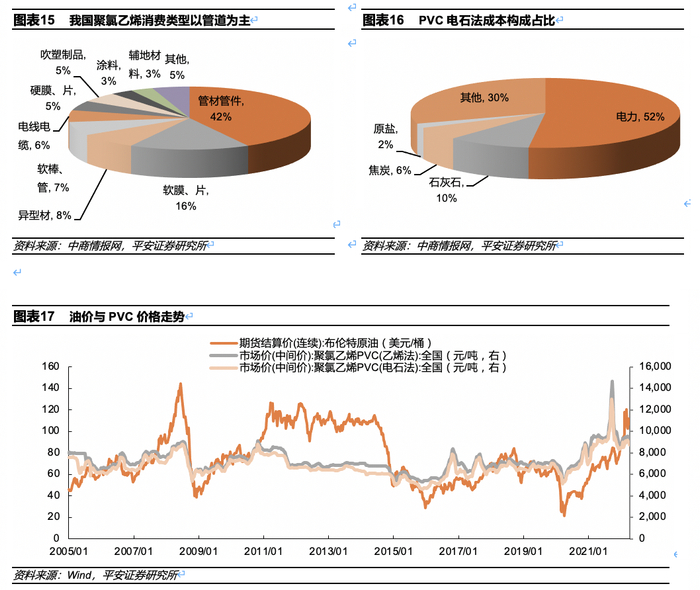 PVC下游以管道为主,需求、电力成本等主导PVC价格变动。需求端,我国PVC消费类型中管道占比较高,约四成左右。成本端,PVC制成法主要包括电石法和乙烯法,国内以电石法为主,其生产成本中电力成本占比过半;乙烯法则是从石油中提取乙烯后经化学反应得到聚氯乙烯树脂,生产成本主要关注石油价格。从两种方法价格看,乙烯法和电石法PVC呈现联动,价格走势较为一致。2021年9-10月受限电限产影响,电石法PVC市场价一度突破13000元/吨,乙烯法PVC超过14000元/吨,随着能耗双控约束减弱,四季度PVC价格显著回落。进入2022年后PVC价格整体平稳,截至2022年4月末,电石法PVC市场价和乙烯法PVC市场价分别为8,774元/吨、9,253元/吨,同比下降2.6%、1.0%。