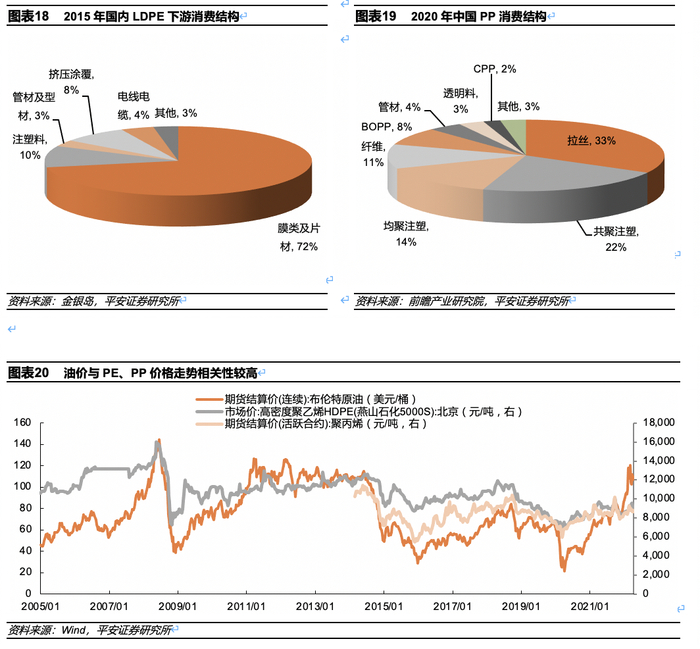 PE、PP下游需求中管道占比较低,需求、油价等主导其价格走势。从需求端看,PP、PE下游应用类型多样,其中PE消费结构以膜类及片材为主,PP消费结构以拉丝、共聚注塑为主,管道需求占比均较低。从成本端看,PP、PE直接原材料为乙烯和丙烯,乙烯、丙烯来源主要是石脑油(原油经过炼制之后的产品之一),因此PE、PP价格走势与油价较为相关。尽管年初以来油价大幅上涨,但因下游需求疲弱,PE、PP价格整体平稳,截至2022年4月末,高密度聚乙烯HDPE(燕山石化5000S)市场价、PP期货结算价(活跃合约)分别为9100元/吨、8651元/吨,同比降低5.2%、增长1.6%。