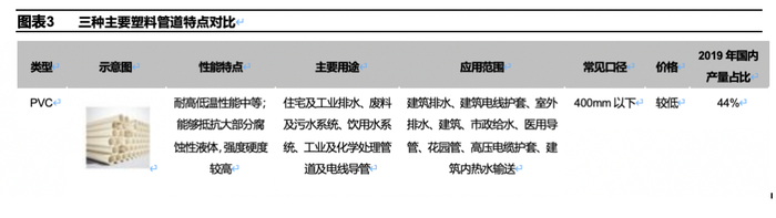 随着PVC管、PE管在耐高温、低温等产品改性上取得进展,PVC管、PE管、PPR管应用场景有所重叠,但三者并非绝对替代关系,例如建筑排水管基本用PVC管,城市燃气用管基本采用PE管,PE管也是市政给水系统首选塑料管道之一,家装冷热水管则大多数采用PPR管。