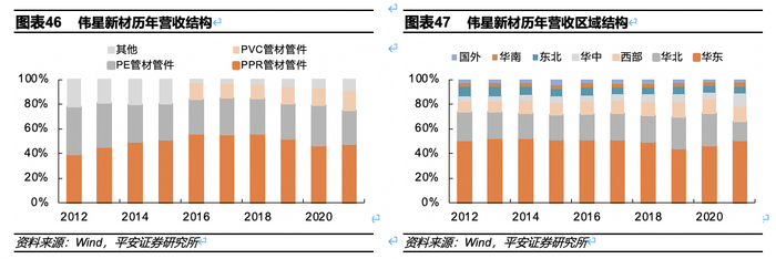伟星新材为PPR管龙头,主要面向零售市场,以华东区域贡献为主。伟星新材主要从事各类中高档新型塑料管道的制造与销售,为国内PPR管道行业技术先驱,PPR产品在国内市占率约8%,2021年公司塑料管道整体销量为29.8万吨。从业务结构看,2021年PPR管营收占比48%,PE管占比27%,PVC管占比16%。公司还实施“同心圆产品链”战略,积极拓展家装防水、净水等新品类业务。从区域结构看,伟星新材收入贡献以华东为主,2021年营收占比51%。