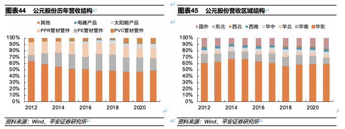 公元股份塑料管道产销规模行业第二,产品同样以PVC管为主,主要布局华东区域。公元股份为国内大型城乡管网建设综合配套服务商,公司产品广泛应用于建筑工程给水、排水、市政工程给水、排水排污、供暖、电力电缆保护、城镇中低压燃气输送、工业系统、农村饮用水、农业灌溉。2021年公司塑料管道销量72.9万吨,年产能100万吨以上,产销规模仅次于中国联塑。从产品结构看,公司以PVC管为主,2021年PVC管、PE管、PPR管营收分别占比50.1%、18.9%、15.3%。从区域结构看,公司布局以华东区域为主,2021年营收占比61%。据公元股份披露,经销渠道占其2021年主营业务收入60%左右,出口(含塑料管道业务和太阳能业务)占比约15%,地产直接配送占比约12%,家装业务占比约6%,市政直接招投标业务工程占比约4%,燃气管道占比约3%。